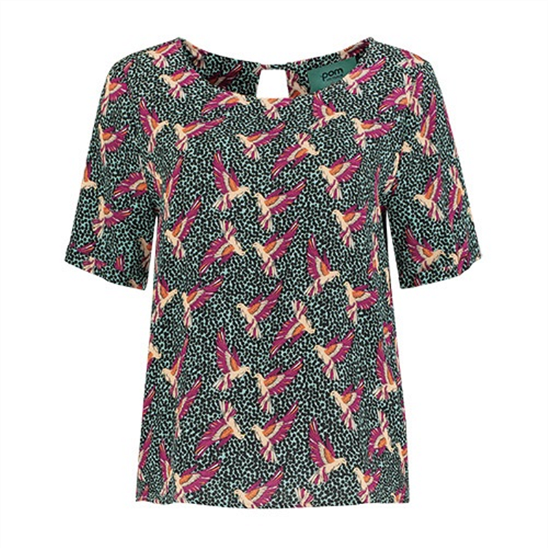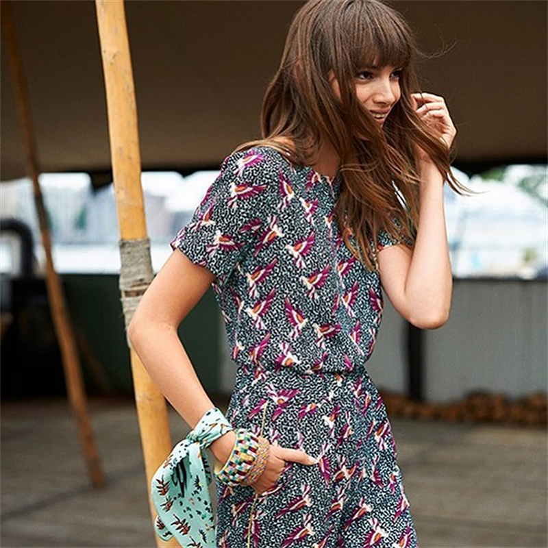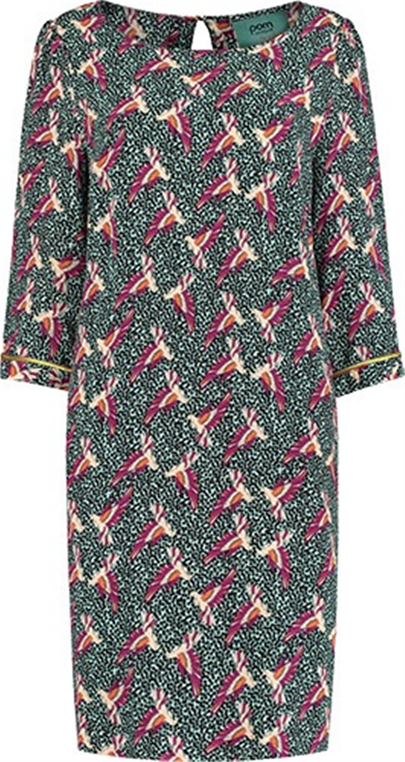 Wow, wat een jurk! Deze prachtige groene maxi-jurk is een geweldige aanwinst voor je herfstgarderobe. De 'urban jungle' print bestaat uit bruine paradijsvogels op een eucalyptusgroene achtergrond. Een leuk detail is het fonkelende gouddraad dat door de stof loopt. De jurk heeft lange mouwen en een knoopsluiting waardoor een split ontstaat. Pasvorm: De jurk heeft een losse pasvorm en valt net boven de enkel. Het model op de foto is 182 cm lang en draagt maat 36