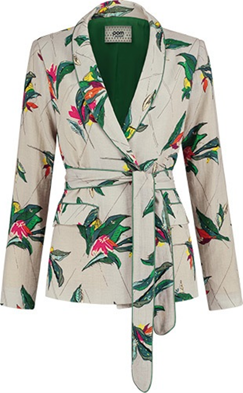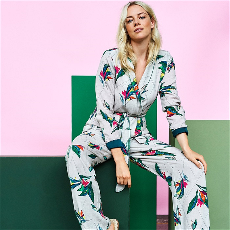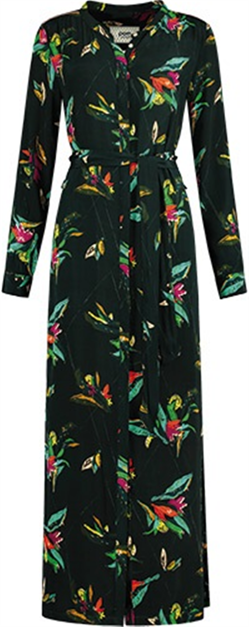 Wow, wat een jurk! Deze prachtige groene maxi-jurk is een geweldige aanwinst voor je herfstgarderobe. De 'urban jungle' print bestaat uit bruine paradijsvogels op een eucalyptusgroene achtergrond. Een leuk detail is het fonkelende gouddraad dat door de stof loopt. De jurk heeft lange mouwen en een knoopsluiting waardoor een split ontstaat. Pasvorm: De jurk heeft een losse pasvorm en valt net boven de enkel. Het model op de foto is 182 cm lang en draagt maat 36